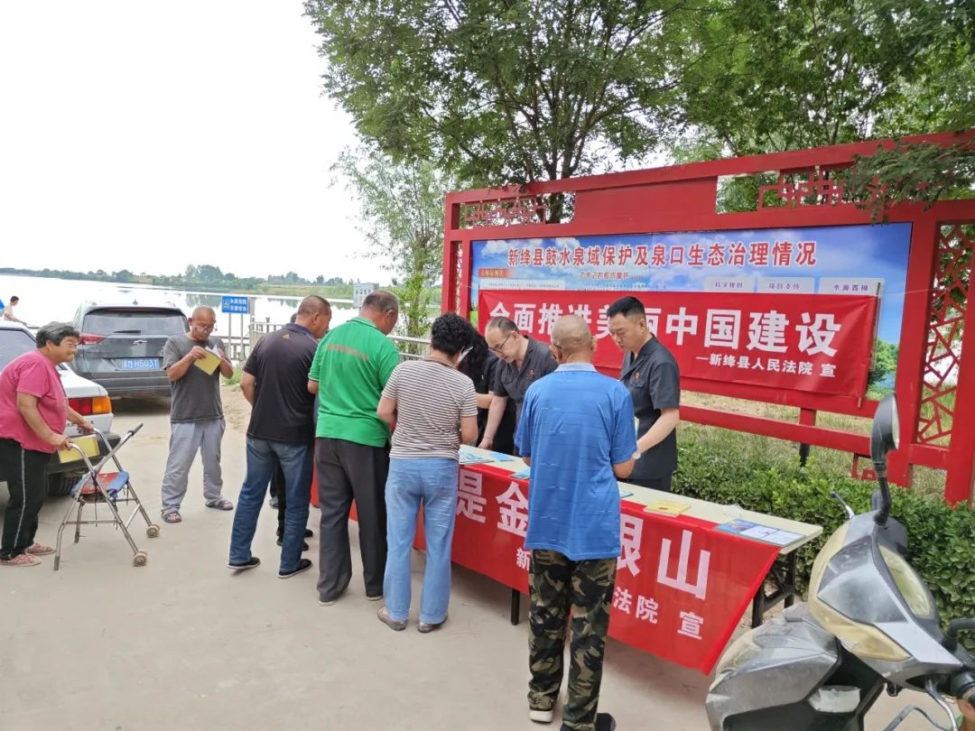 在新绛县三泉镇古堆村三泉水库旁,法官们围绕古堆泉生态环境司法修复,向当地群众讲解古堆泉保护的重要性,向群众宣传《中华人民共和国黄河保护法》、《运城市古堆泉水资源保护条例》等法律、法规,引导群众树立环保理念,爱惜水资源、节约水资源,保护水资源,积极同破坏水资源、破坏生态环境的违法行为做斗争。