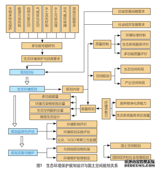 为保障一张蓝图绘制到底, 推进高质量发展, 生态环境保护规划的重要结论 (主要包括生态环境要素组成的多功能专题规划) 应纳入国土空间规划体系和国民经济和社会发展规划中。通过提炼生态环境保护和抚育要求, 结合区域发展战略需求和社会经济发展需求, 明确生态环境保护规划目标, 最终制定生态环境保护规划, 落实在质量控制和空间规划中。依据宏观层面的生态环境保护规划制定各要素专项规划和微观层面的生态设计, 制定规划检测和评估机制, 建立规划实施维护机制。最终, 将空间落实的主要结论纳入国土空间规划中, 将与社会经济协调的主要结论纳入国民经济与社会发展规划中, 将其他结论纳入生态环境检测、评估、实施机制中。生态环境保护规划设计与国土空间规划关系见图1。